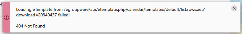 PHP message: EGroupware\Api\Etemplate\Widget\Template::instance(‘calendar.list.rows’, ‘’, ‘’, ‘’) template NOT found!;