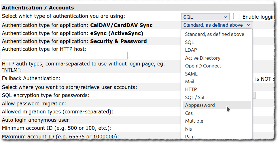 It is now possible to enforce app passwords for authentication in the EGroupware Setup for CalDAV/CardDAV and eSysnc (ActiveSync). This means that it is no longer possible to log in there with normal access data.