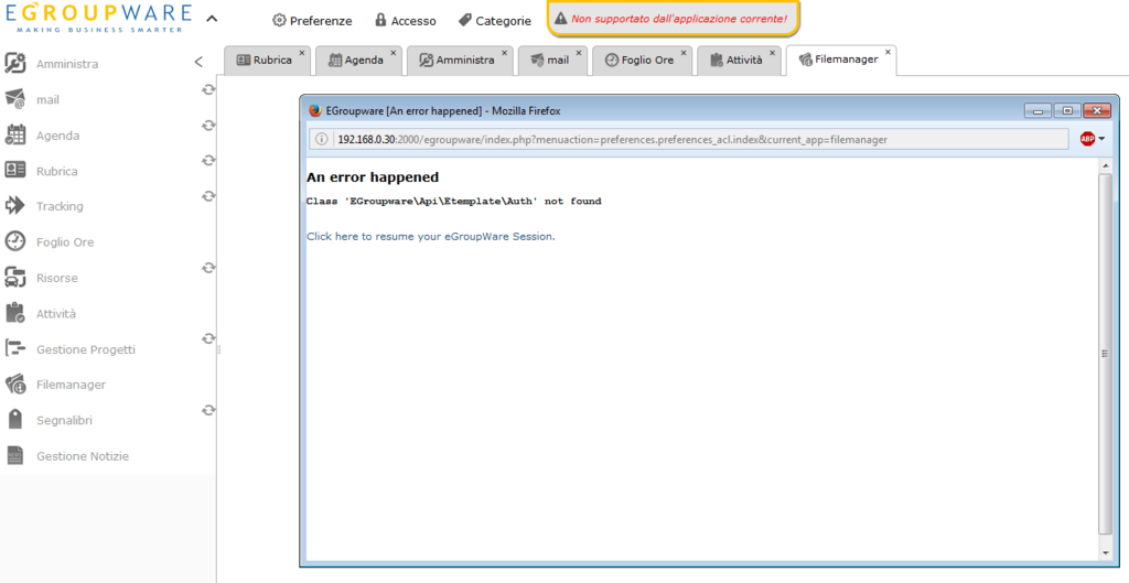 [Thu Jan 05 14:22:10.488747 2017] [php7:notice] [pid 5396:tid 1000] [client 192.168.0.101:50027] An error happened (Error): Class ‘EGroupware\Api\Etemplate\Auth’ not found, referer: http://192.168.0.30:2000/egroupware/index.php?cd=yes